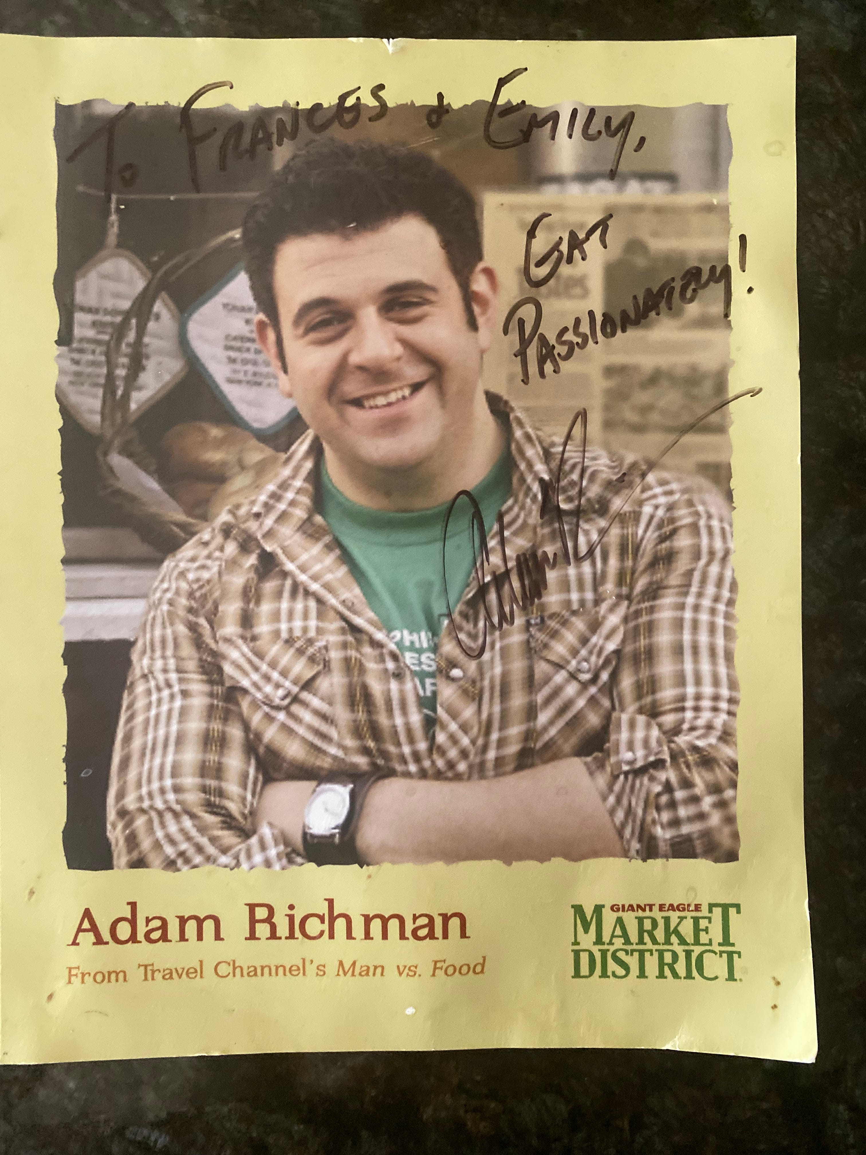 One of those new content things is a monthly interview series for paid Substack subscribers launching next week starting with the one and only Fedner family favorite: Adam Richman! Man vs. Food was a staple of my life growing up and, in fact, my mom once met Adam Richman at a Giant Eagle in Columbus, OH and she had him sign a photo for me and my sister - check it out below. What a full circle moment.